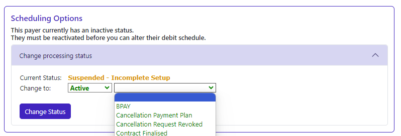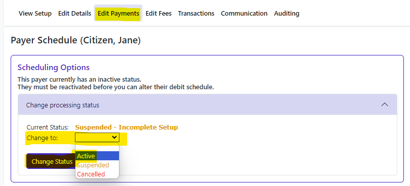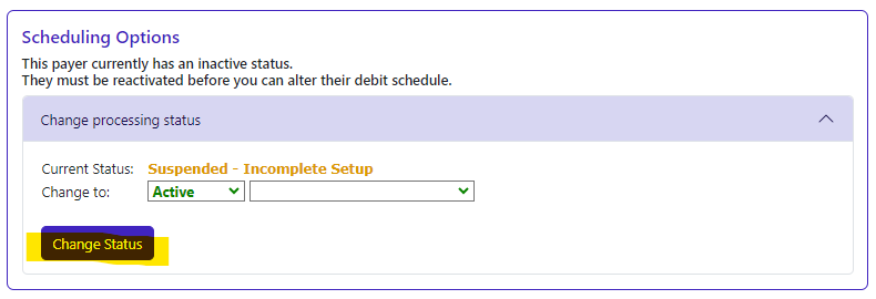 Your new customer will have a Payment Status of ‘Suspended - incomplete setup’.