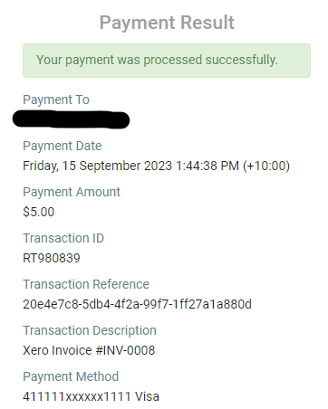 A successful payment will take the customer to a receipt page detailing the successful payment.