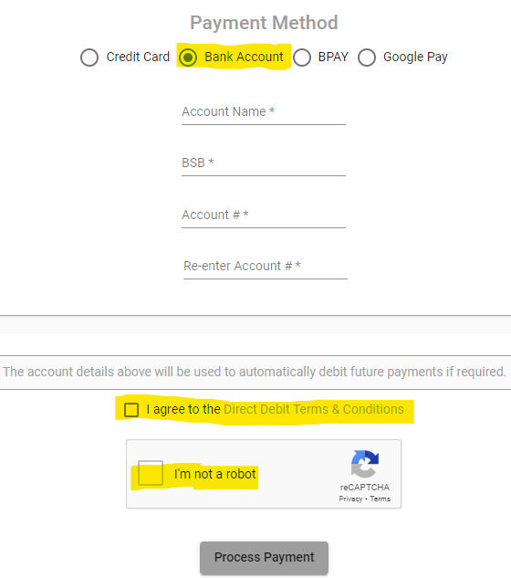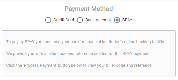 There are four payment options that can be available: credit card, bank account, BPAY or Pay ID.