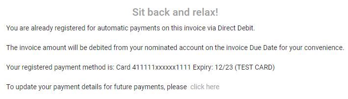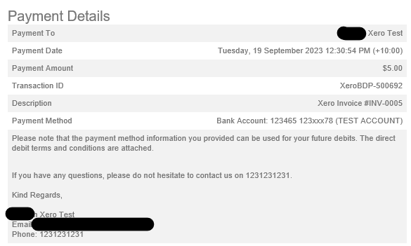 A confirmation email will also be sent to your customer – this will include a PDF document detailing their updated authorisation for the automatic debit of future invoices.
