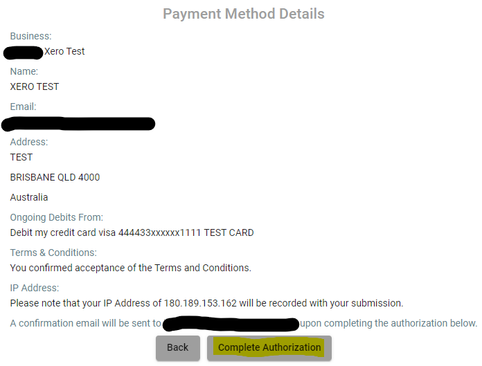 A confirmation page will then be displayed with their updated details. The customer then clicks on Complete Authorisation.